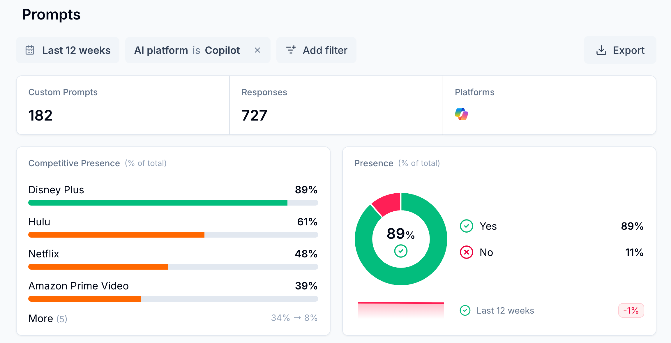 For example, say you’re a streaming service like Disney+. When someone asks, “What’s the best streaming service?”, you can see whether your brand is mentioned and where it ranks compared to competitors like Netflix and Amazon Prime Video.
