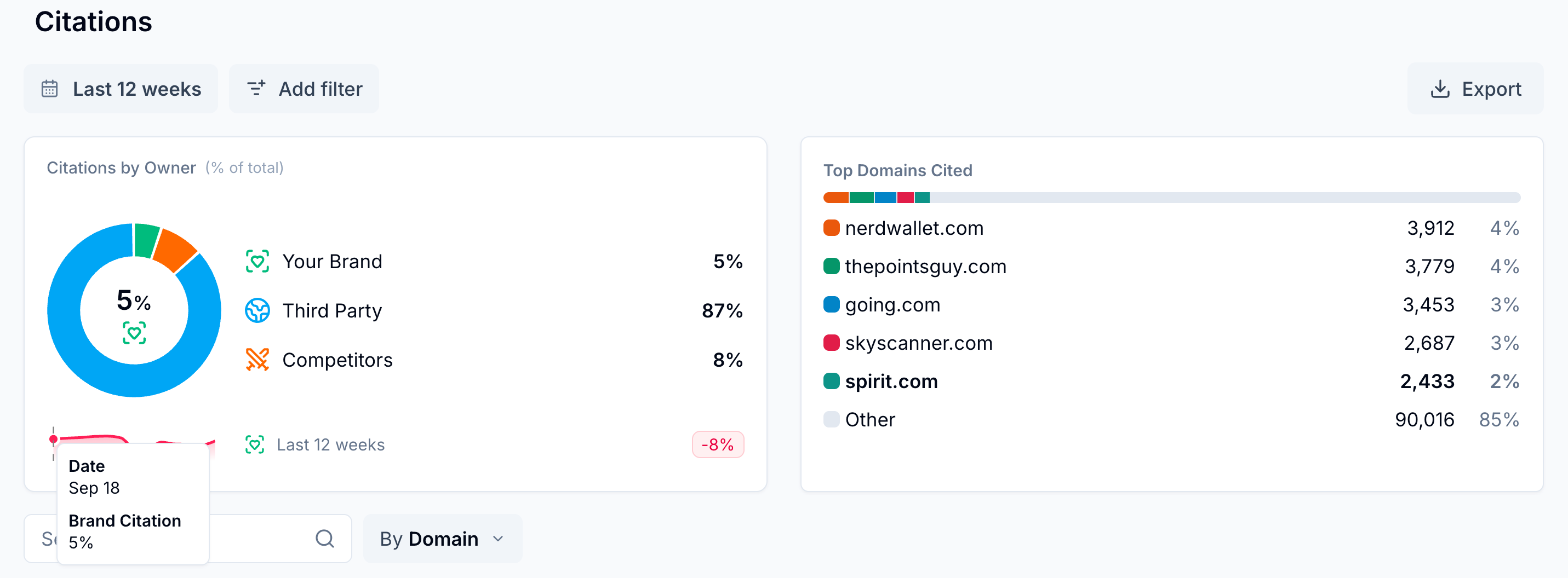 - Which domains are most frequently cited in Copilot responses, including your brand, your competitors, and third-party sources