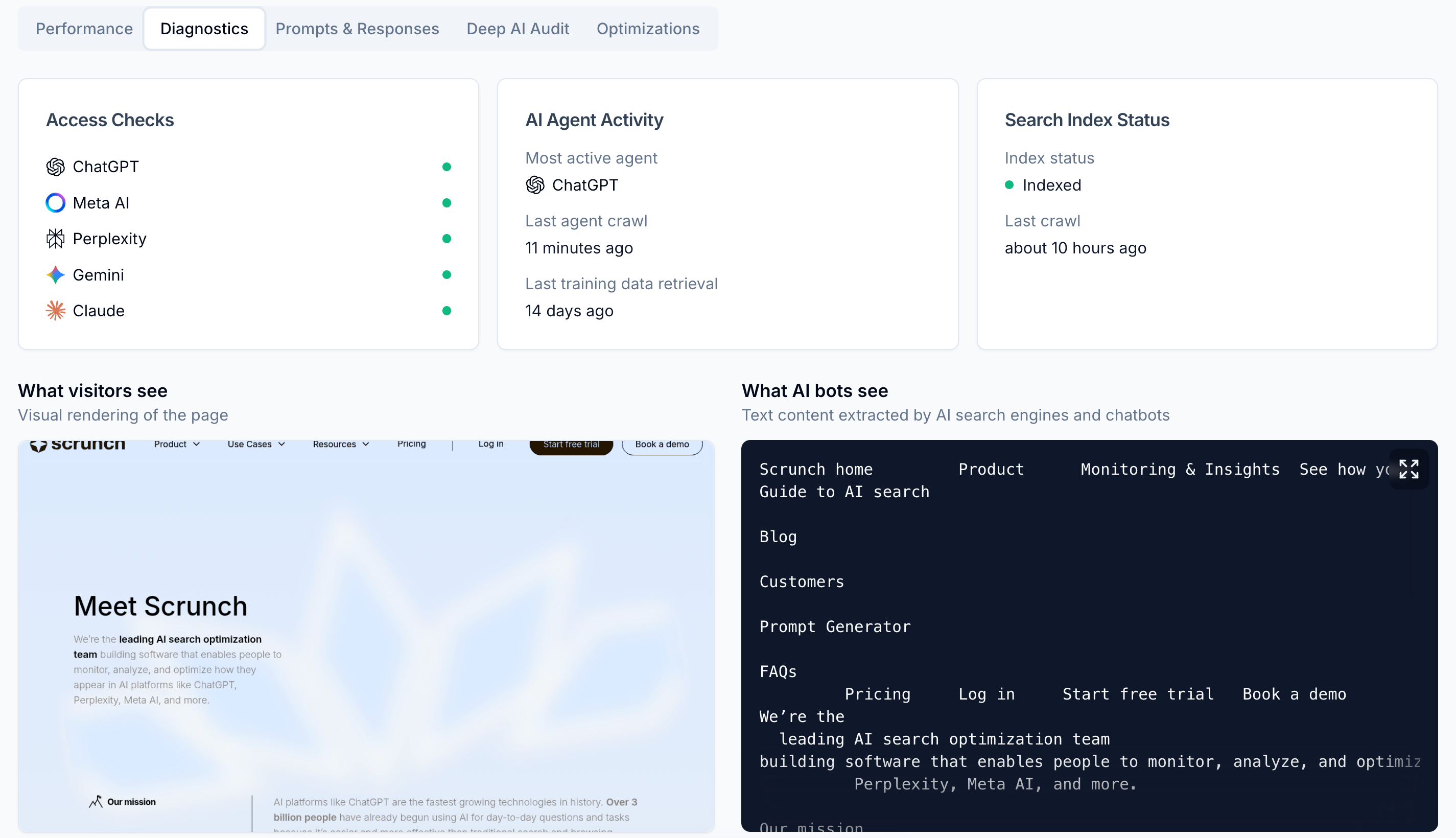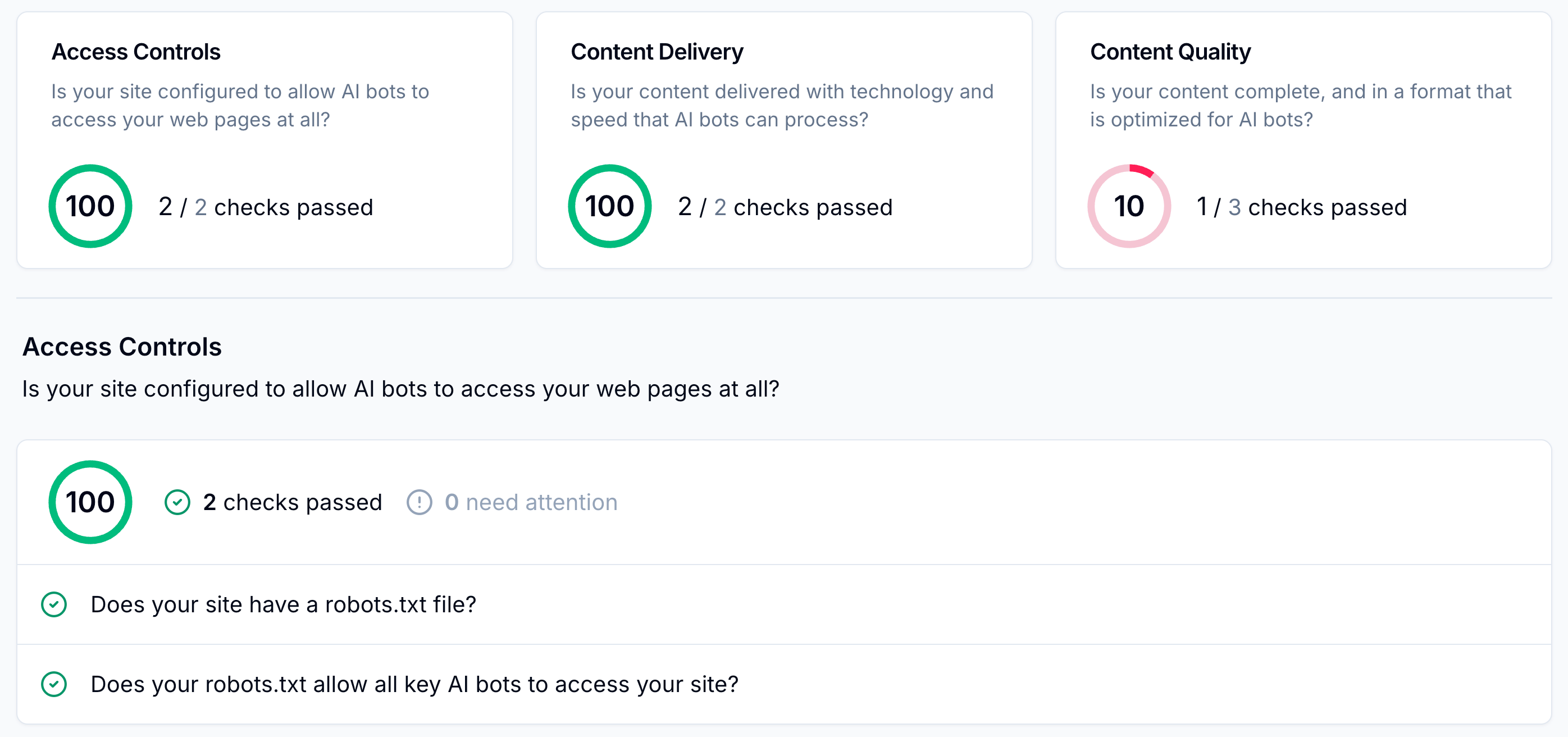 - Access controls: Whether your site is configured to allow AI agents to access the page
