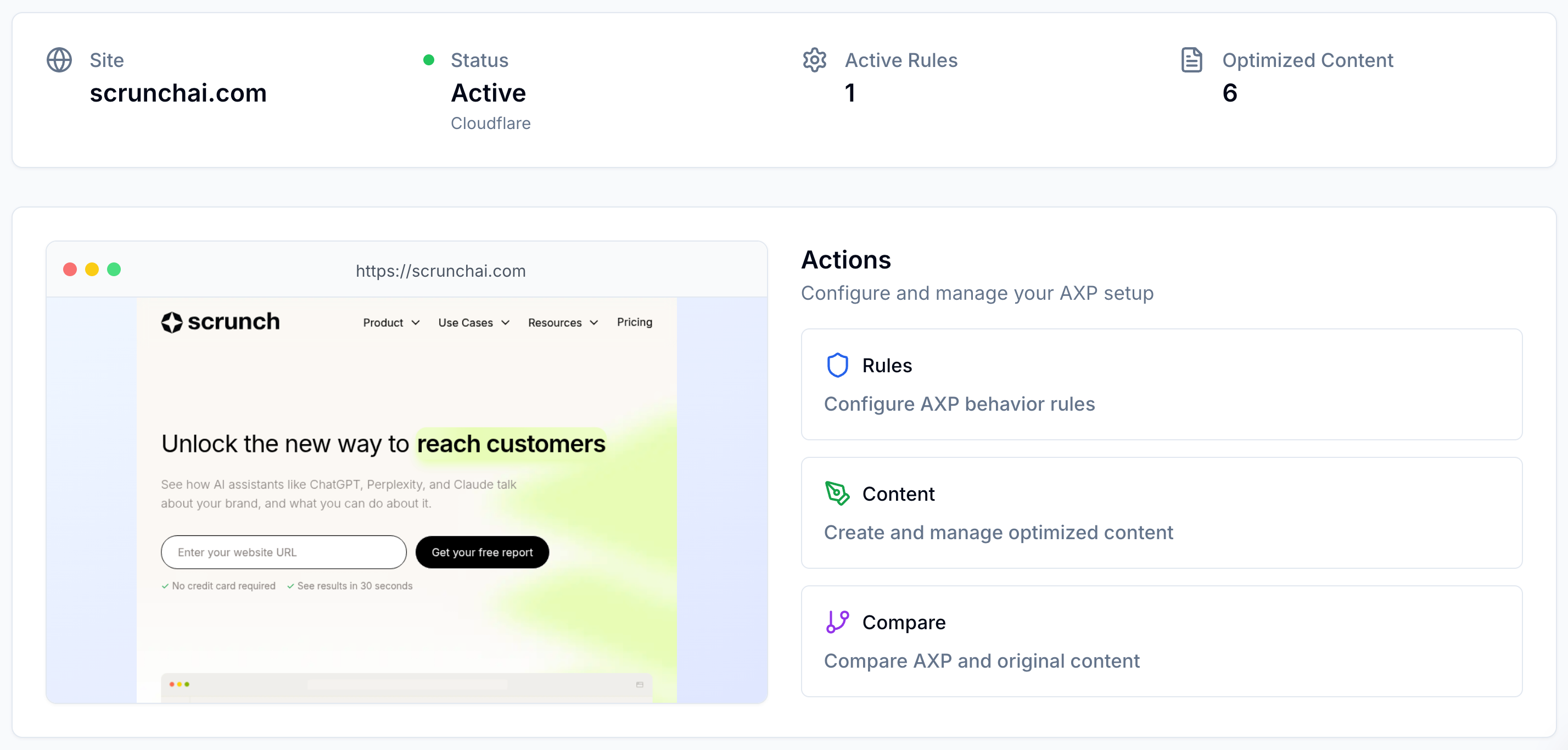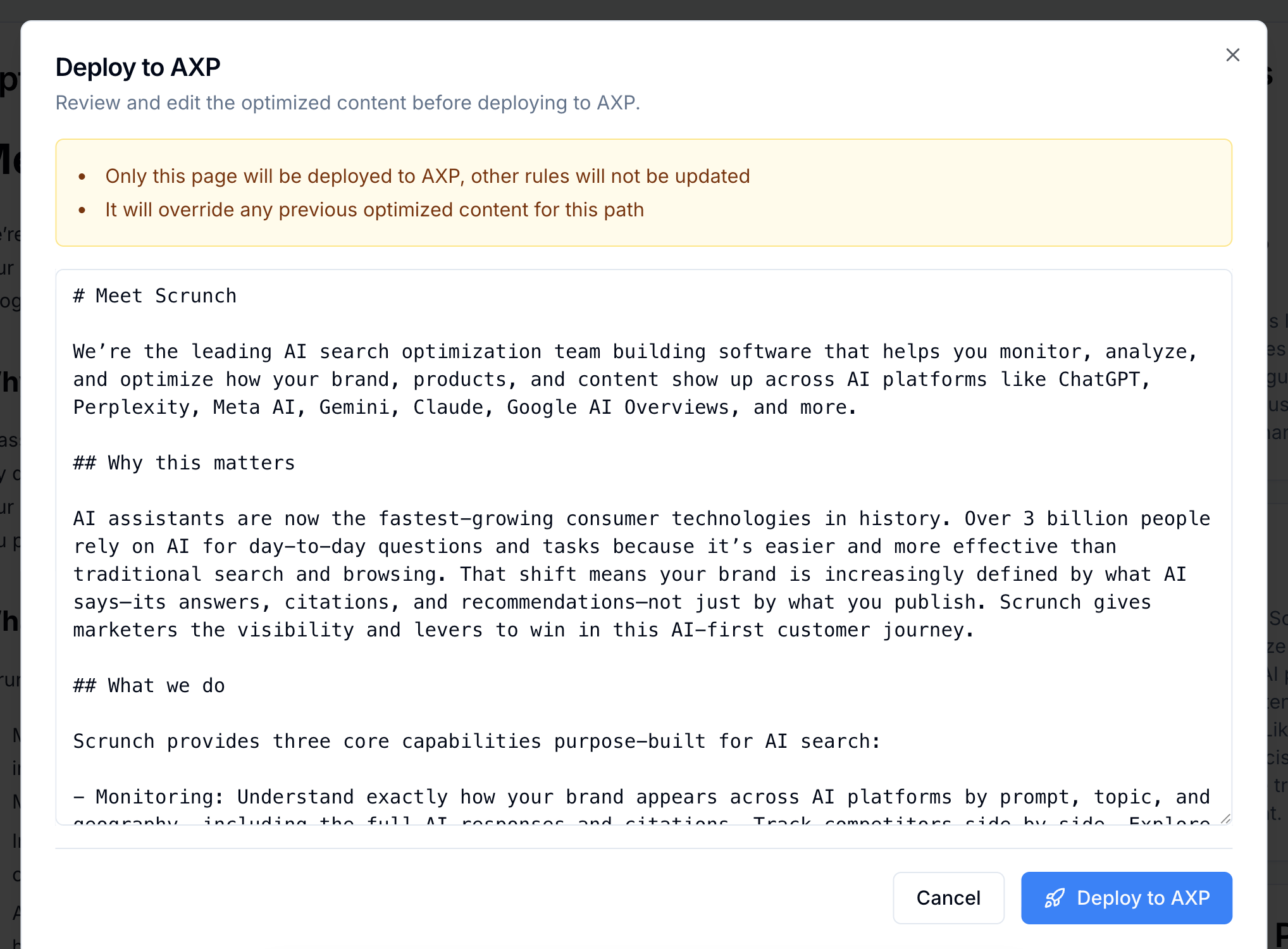 After the page has been deployed to AXP, Scrunch automatically serves up the optimized content when it detects AI agents trying to retrieve it.