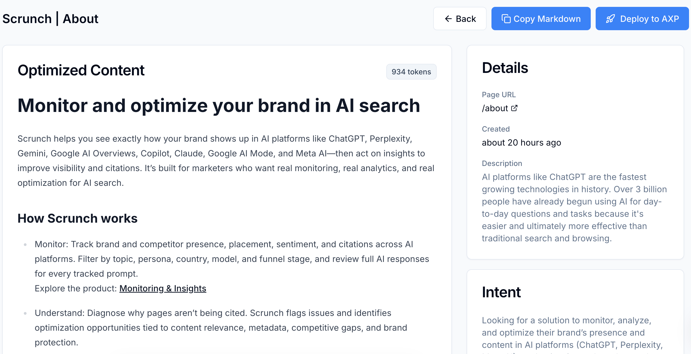 Everything looks good, so you click the “Optimize Page” button at the bottom of the screen and Scrunch generates an updated version of the page fine-tuned for AI.
