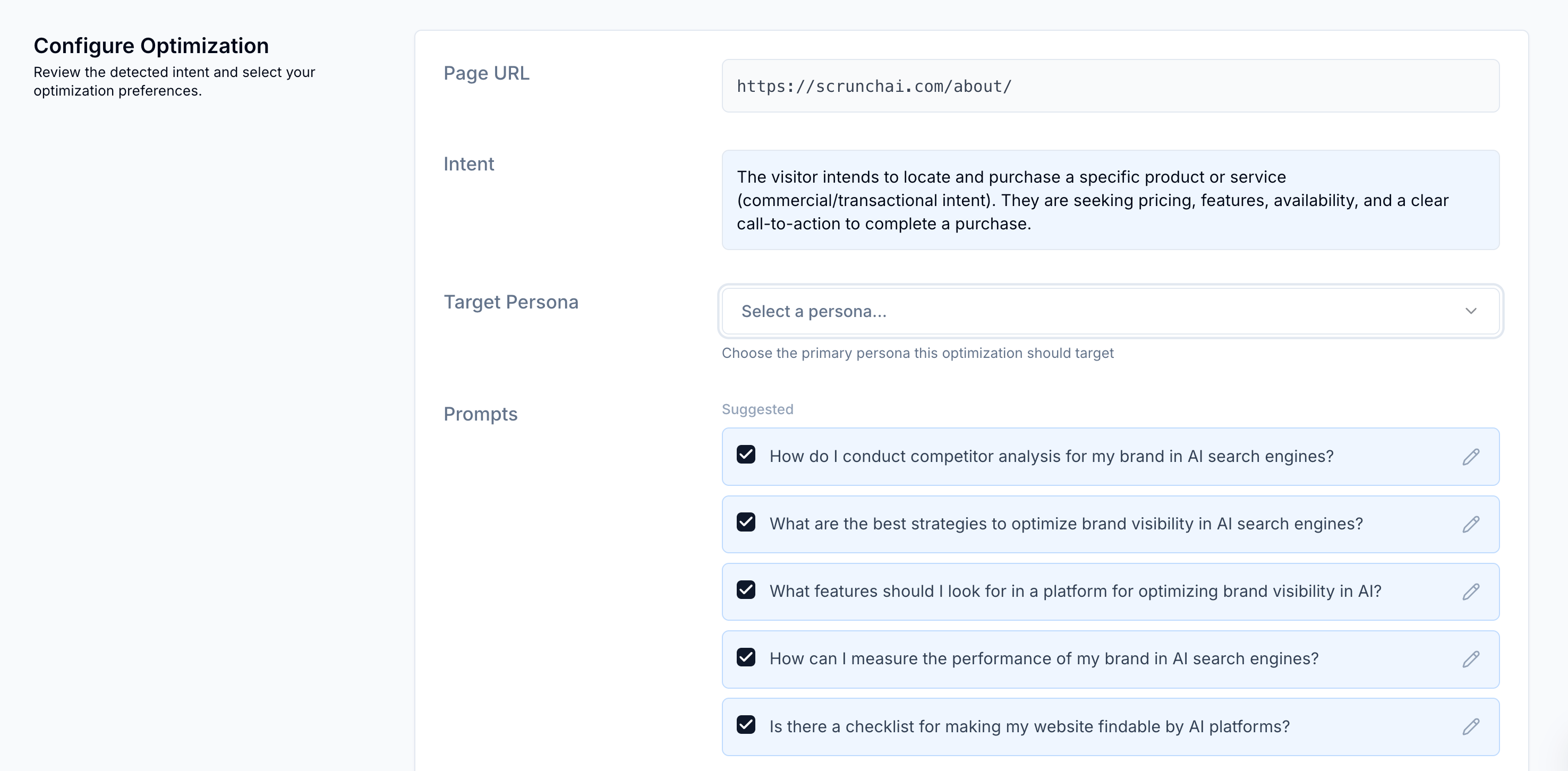 So Scrunch analyzes the page in question and returns a fully customizable optimization plan, including: