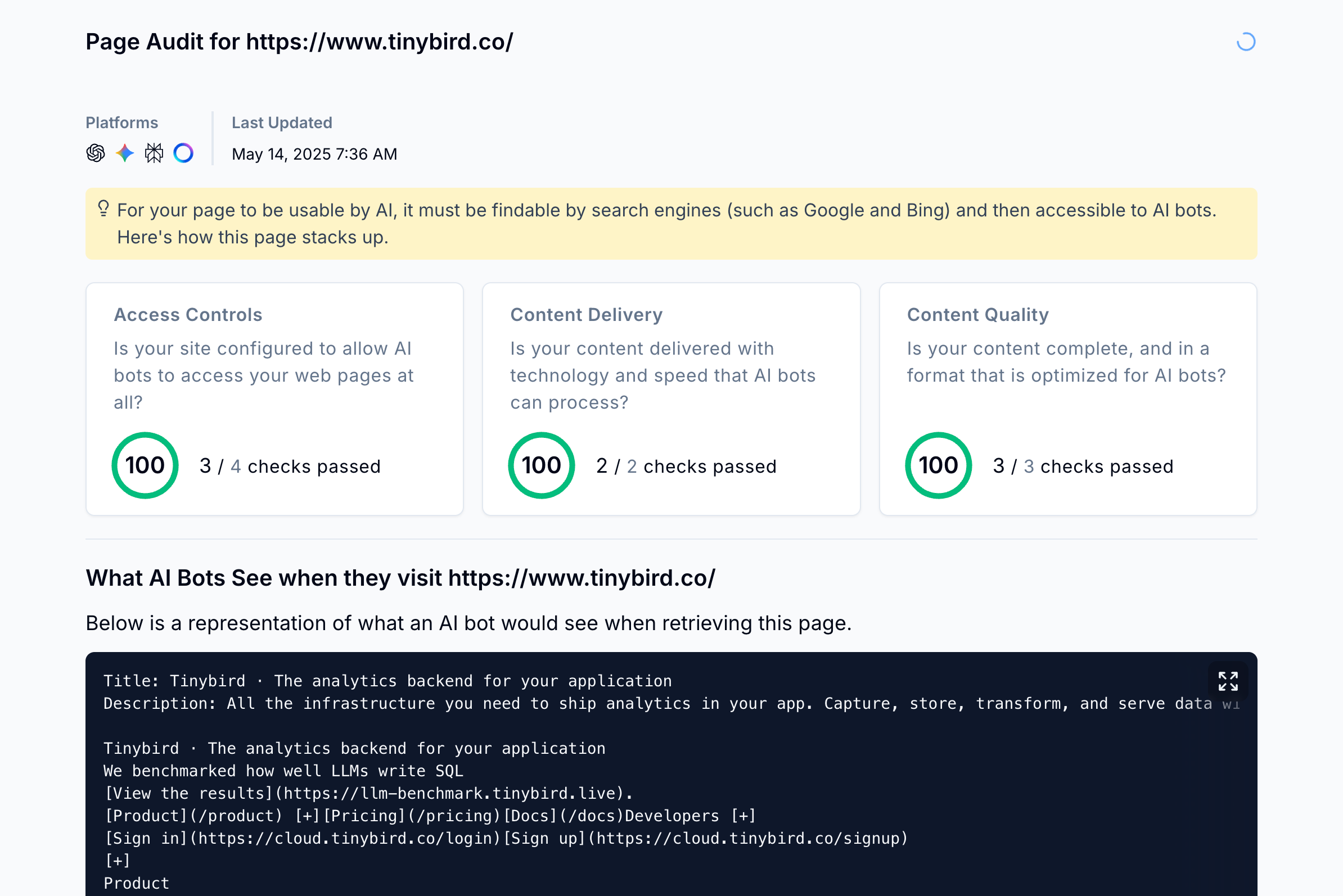 Which webpages on Tinybird’s site get the most love for certain prompts. Potential on-site errors preventing AI agents from consuming Tinybird’s content.